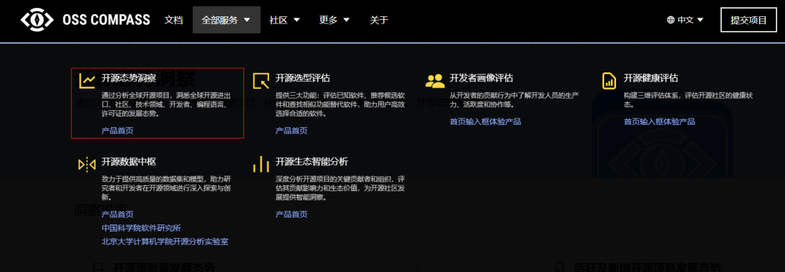 Step1: 首先,访问 OSS-Compass 官网:https://oss-compass.org,点击导航栏的"全部服务",选择开源洞察洞察,按需订阅七大洞察维度。